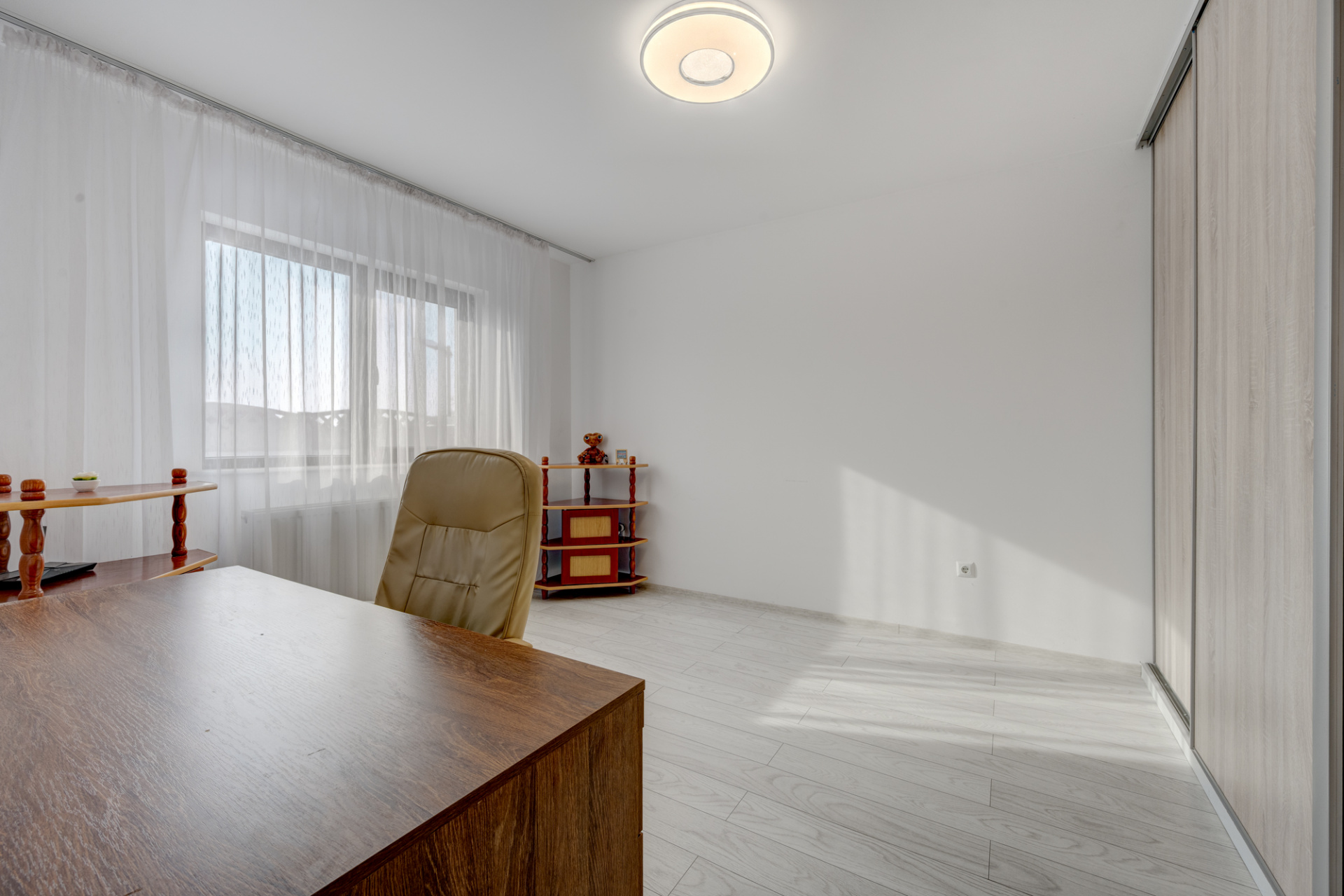 Bucataria este complet mobilata si utilata (aragaz, hota, masina de spalat vase, frigider). Dormitorul de la parter este amenajat cu un dulap generos si birou. Livingul este amenajat cu o canapea, comoda TV si spatii pentru depozitare. Fiecare dormitor are pat iar cel matrimonial are amenajat un dressing deschis.