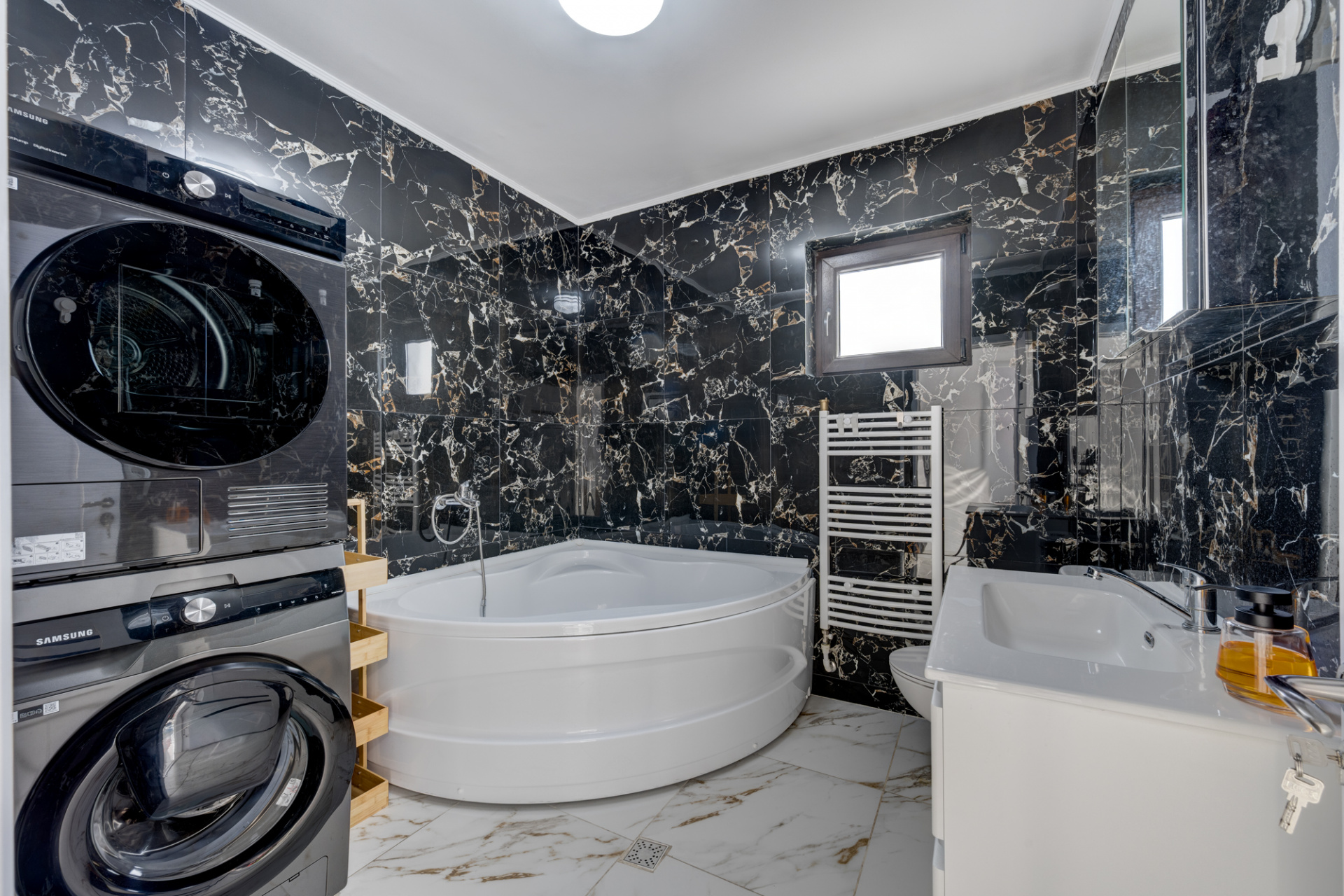Baia principala de la etaj este amenajata complet si echipata cu obiecte sanitare, cada, masina de spalat rufe si are si fereastra pentru aerisire naturala. Baia parterului nu este amenajata ( in momentul actual este la gri, are toate instalatiile pe pozitii, este achizitionat deja vasul de toaleta si bazinul incorporat). Baia necesita montaj de gresie, faianta si obiecte sanitare.